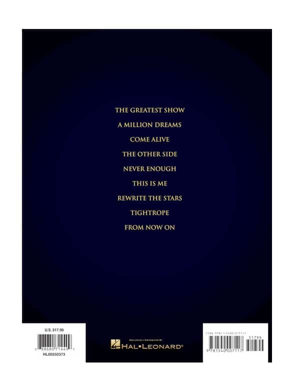 A musical drama biopic chronicling P.T. Barnum (played by Hugh Jackman) and his founding of the Barnum & Bailey Circus. This December 2017 film features a stunning soundtrack by Benj Pasek and Justin Paul of La La Land and Dear Evan Hansen fame. Our songbook features piano/vocal/guitar arrangements of 9 songs including the Golden Globe-winning ”This Is Me”. Includes full-colour scenes from the movie.