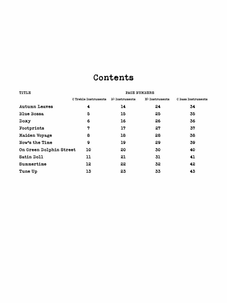 This volume includes 10 songs: Autumn Leaves · Blue Bossa · Doxy · Footprints · Maiden Voyage · Now’s the Time · On Green Dolphin Street · Satin Doll ·Summertime · Tune Up. Check out the interactive play-along tracks below!