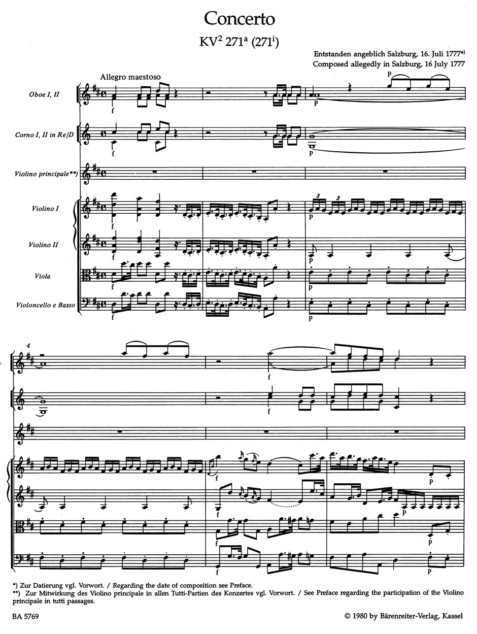 Mozart, Wolfgang Amadeus: Concerto for Violin und Orchestra D-major K. 271a (271i) (partitur, urtext)