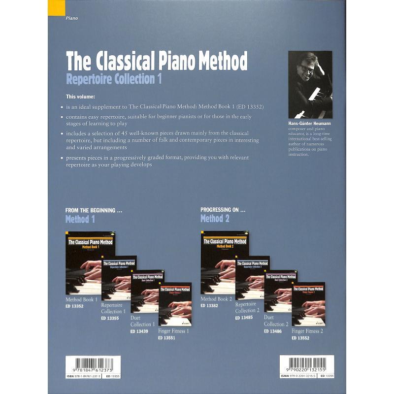 About this book – Repertoire Collection 1: Repertoire Collection 1 provides 45 extra pieces explicitly linked to the levels of progression (starting with beginners) found in Method Book 1, providing a wider range of beautiful pieces for the solo pianist. This book is a great supplement to Method Book 1 if you want further enjoyable pieces which will help your learning at each stage of your development. In line with The Classical Piano Method, the pieces are drawn mainly from the classical repertoire, and also include a number of folk and contemporary pieces in interesting and varied arrangements. This book is, of course, also a very useful standalone collection of progressively-graded repertoire in its own right, providing relevant repertoire as the pianist’s playing develops. Suitable for pianists in the early stages of learning to play. About The Classical Piano Method: This is ideal for adults and young people looking to learn the piano from scratch, or for those returning to the piano after a substantial break from playing. As the learner, you will gain a traditional, classic technique, and will be introduced to interesting, varied and well-known classical pieces right from the outset. The method is friendly and is carefully designed to progress in small manageable steps, beginning with simple fingering patterns and exercises, moving onto some of the most beautiful melodies and pieces from the baroque, classical and romantic eras: such as the Ode to Joy, Für Elise and the Blue Danube Waltz. The Method Books lead you through a range of exercises, repertoire pieces to learn, theory checks, clear instruction & diagrams on playing and technique, tips on practising, and composer biographies. They also enclose a CD on which you can listen to all the pieces performed on a grand piano by a concert pianist, as well as some additional accompanying parts which you can use as play-along tracks. Learning is made interesting, informed and fun. Method Book 1 includes lessons on posture, hand positions, staves, clefs, chords…. Method Book 2 includes lessons on intervals, changing hand positions, cadences, inversions, triplets, syncopation, 6/8 time…