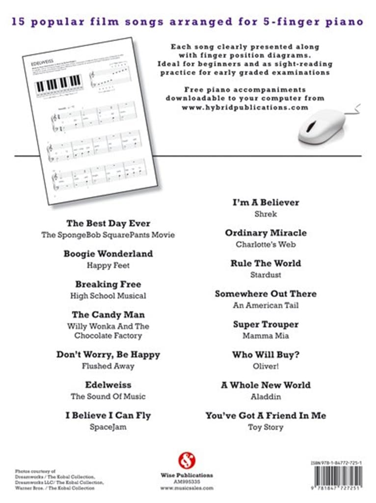 Fifteen popular film songs arranged for five finger Piano.