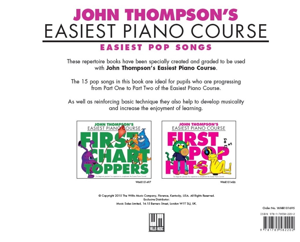 This Easiest Pop Songs edition of John Thompson’s Easiest Piano Course allows the beginner pianist, who is progressing from part one to part two of the world-renowned course, to learn some fantastic and well-known pop songs. With simplified arrangements and large notation, these are popular hits in the familiar John Thompson style.