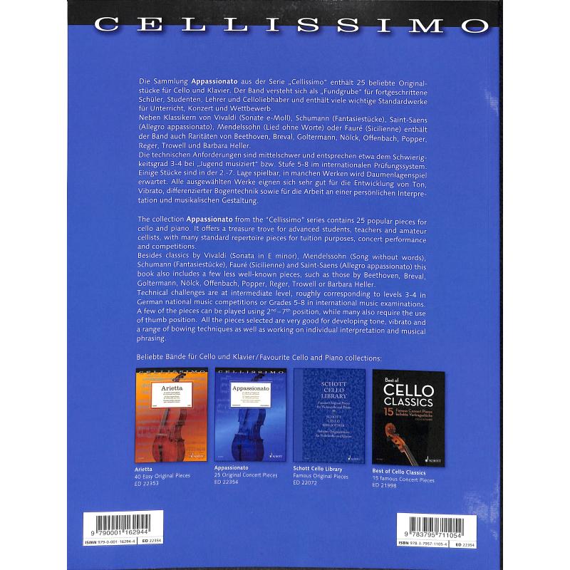 Volume 2 of the Cellissimo series contains 25 popular original pieces for cello and piano from the Baroque, Classical and Romantic eras and is a real treasure trove for advanced pupils, students, teachers and cello lovers. The cello literature comprises a lot of major standard works for lessons, concerts and competitions. Apart from classics by Vivaldi, Bréval, Beethoven, Mendelssohn, Schumann, Faurè, or Saint-Saëns, the volume also contains several lesser known pieces, e.g. by August Nölck (1862–1928) and Georg Goltermann (1824–1898). The pieces are of medium technical difficulty which corresponds to grade 3-4 or grade 5-8 of the international examination system. Some pieces can be played in the 2nd to 7th position, while several works require putting the thumb under. All selected works are particularly suitable for the development of sound, vibrato, differentiated bowing technique, as well as the performer’s personal interpretation and musical presentation. Some of the pieces come with a basso part (violoncello 2) which is available for download free of charge